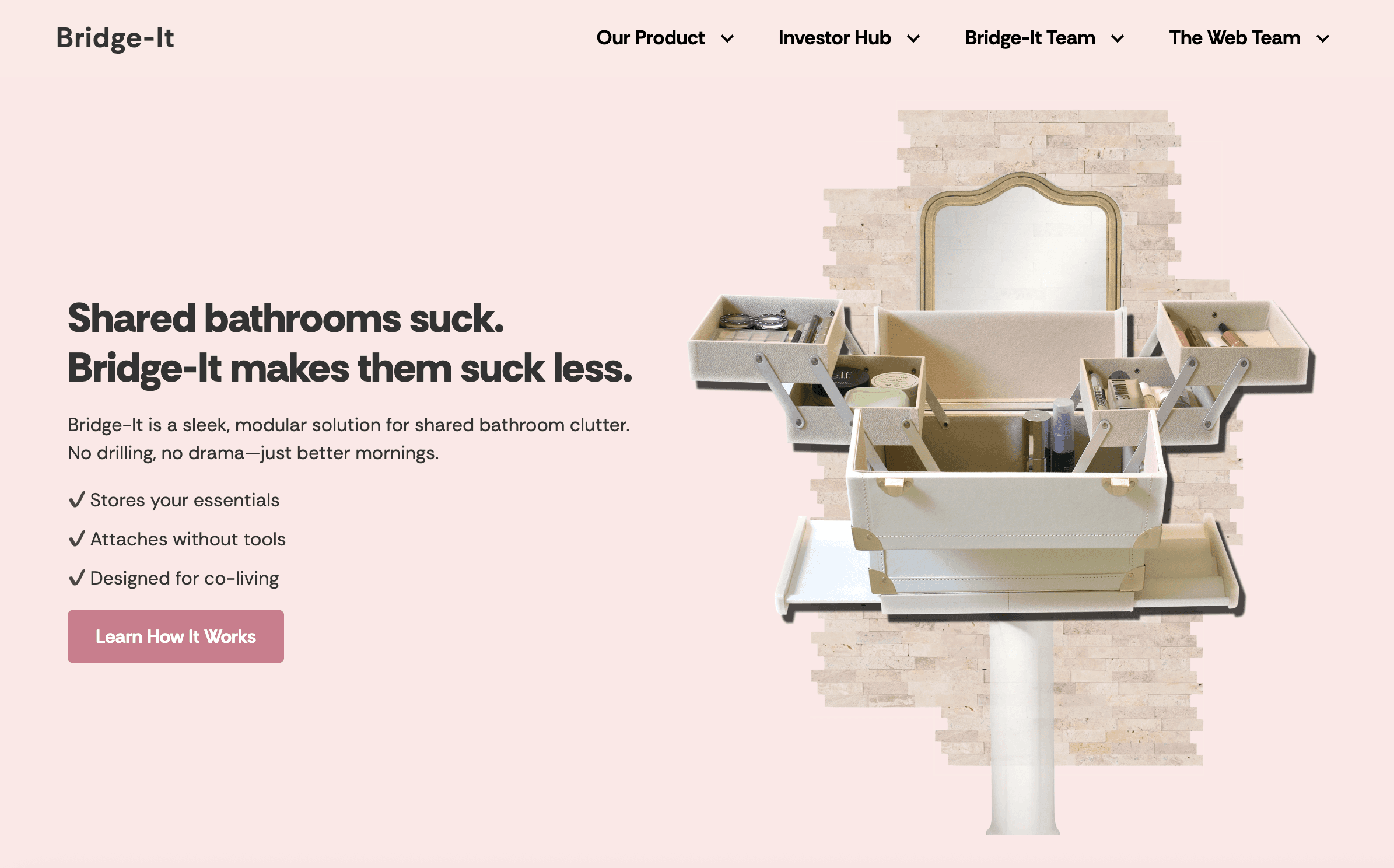 Bridge It is a foldable bathroom organizer originally developed by a separate student team. Our task, within a front-end development course, was to translate their physical product into a scroll-based, animated web experience designed to communicate the product’s function, story, and value to both investors and customers.
